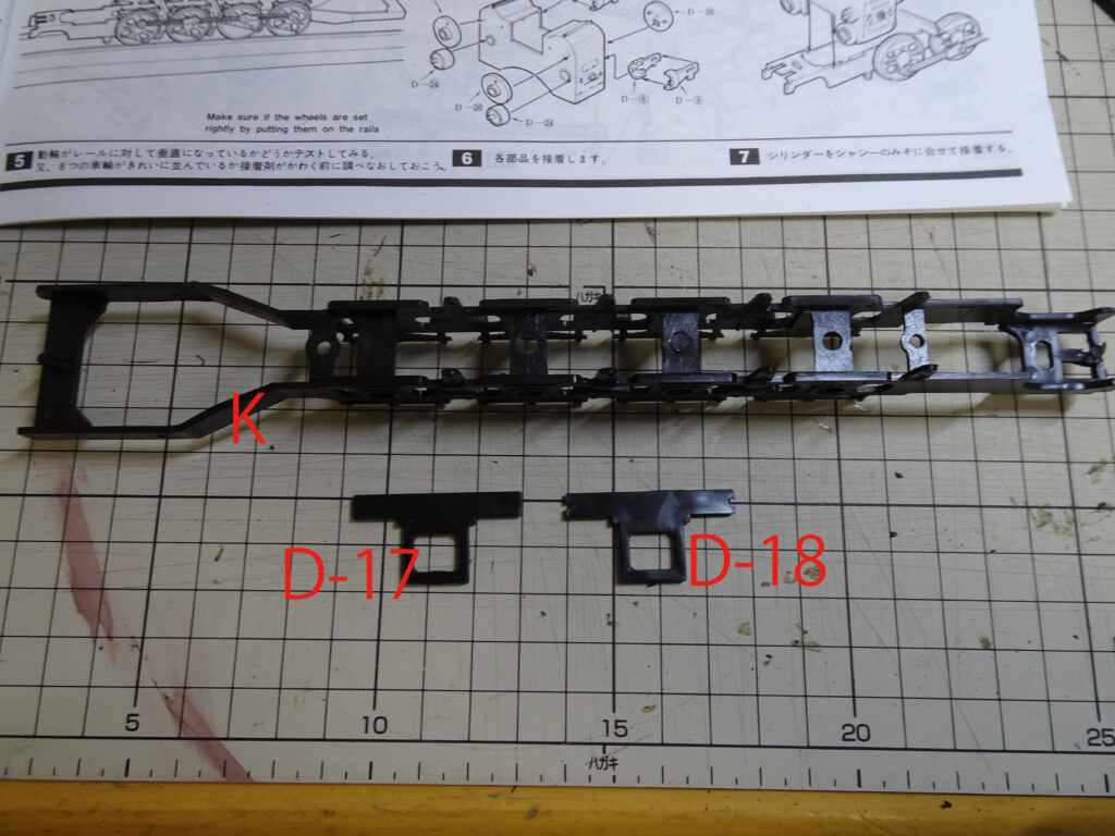 台枠Kに、加減リンク受け台(前)D-17と(後)D-18、ブレーキ装置D-21を接着します。今回の組み立て全般に言えることですが、金型の合わせ目から流れ出たと思われるペラペラの薄い樹脂が結構見受けられますので、これらを除去する必要があります。また、ランナーから切り離した部分の突起やバリはきれいに除去する必要があります。
