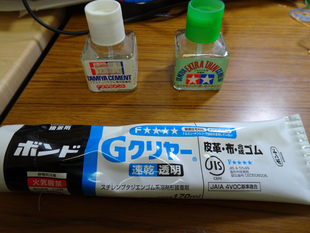 接着剤は画像1のようなタミヤセメントとボンドGクリヤー(溶剤で希釈して使用)を使用しました。強度が必要でなく、接着面が平で広い部分はタミヤセメントを使用して、ある程度強度が必要なところや接着面が小さい部分はボンドGクリヤーを溶剤で希釈してサラサラ状態にしたうえで接着しました。