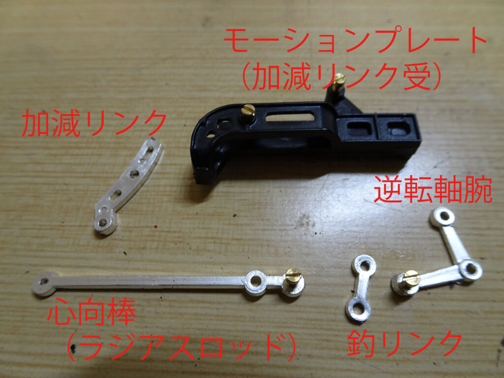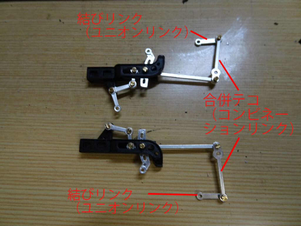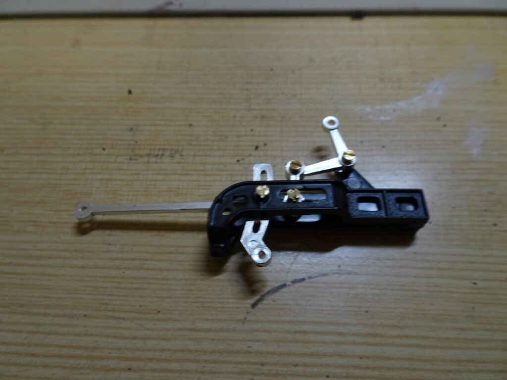 心向棒に合併テコと結びリンクを画像3のようにねじ止めします。ねじ止め側の穴と可動側の穴がありますので、説明書を見ながら注意して組み立てます。ねじ止め側の穴は心向棒と結びリンクの穴です。画像1のように組み立て前に、あらかじめ小ねじをねじ込んでねじ山を成型しておくと幾分組み立て易いように思います。
