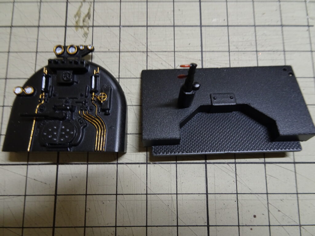 説明書では塗装の指示はないのですが、別途作った焚口戸の塗装や、計器類の色がシルバーでは味気ないので、全体をセミグロスブラックでスプレーし、計器類や配管類をゴールドで、計器盤、水面計をホワイトで、プレーキハンドルをブラウンで、それぞれ画像2のように筆塗りしました。