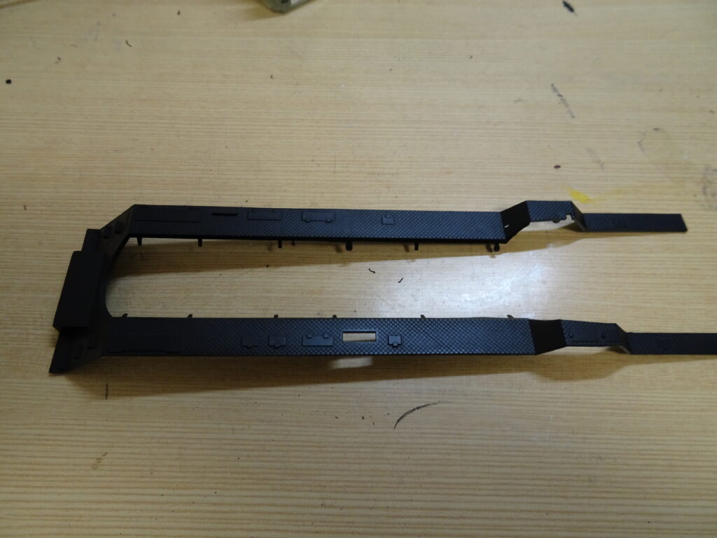 次に工程24のランボードも取り付け前に塗装しました。先にセミグロスブラックをスプレーしたあとに、マスキングをして、マットホワイトをスプレーしました。ランボードは上面が網目状に凹凸があり、側面は真っ平ではないので、マスキングが難しい部分でいつも苦労します。