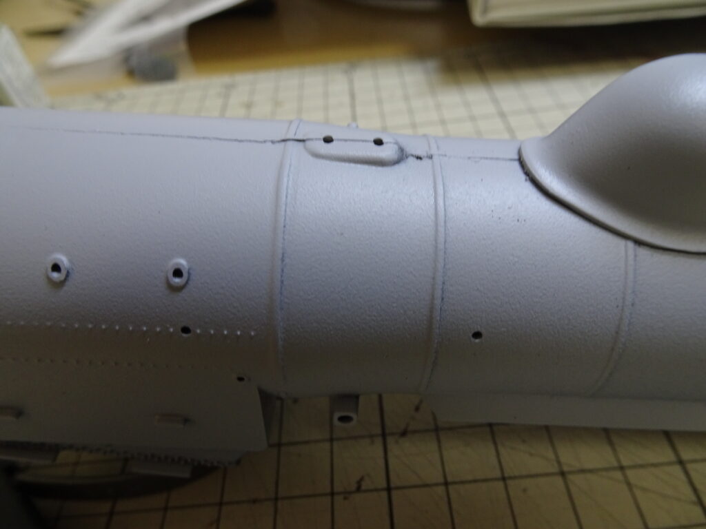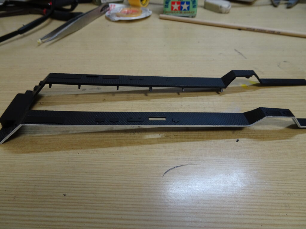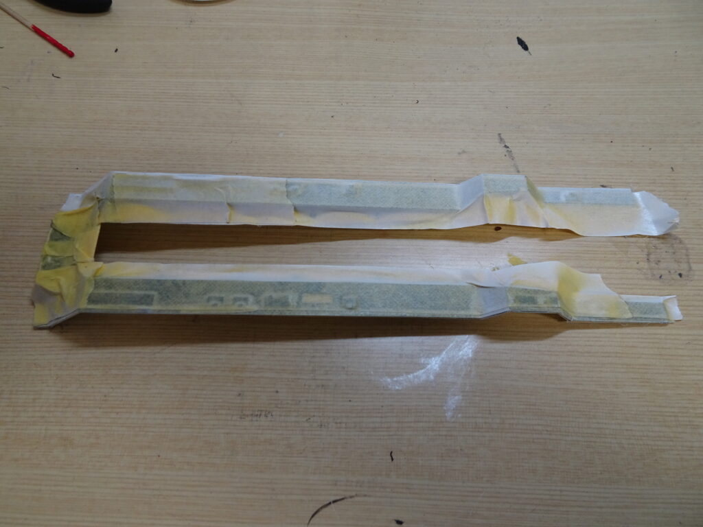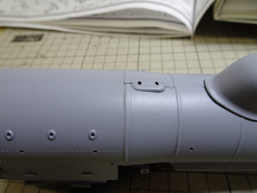 サーフェーサーをスプレーしたあとに、セミグロスブラックをスプレーしますが、サーフェーサーをスプレーした段階で、つなぎ目の段差が画像2左のように結構目立ったので、やすりと紙ペーパーで簡単に滑らかにしたあとに、画像2右のように再度サーフェーサーをスプレーしました。細かい部分の段差は取りきれていませんが、割ときれいにできました。