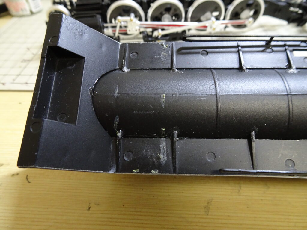 ボイラー・運転室と下回りをしっくりとはまる位置に何気なく接着したのですが、後工程で、前梁を接着する際に、画像3左のように前梁を接着する部分がずれていることが分かりました。正しくは画像3右の位置でした。