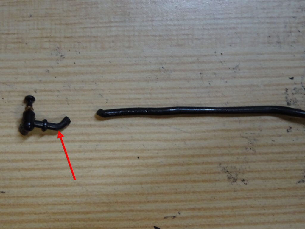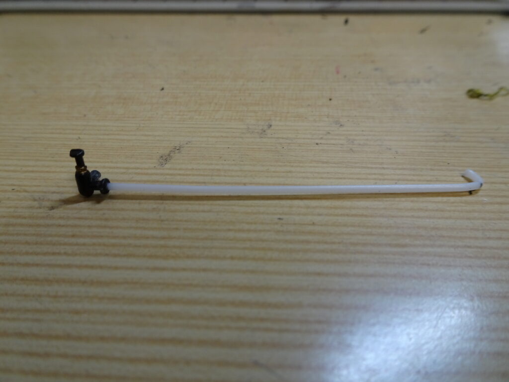 やむを得ず1mmの樹脂棒を使って画像2右のような部品を作り、逆止弁の折れた部分を除去して、1mmの穴をあけ差し込みました。