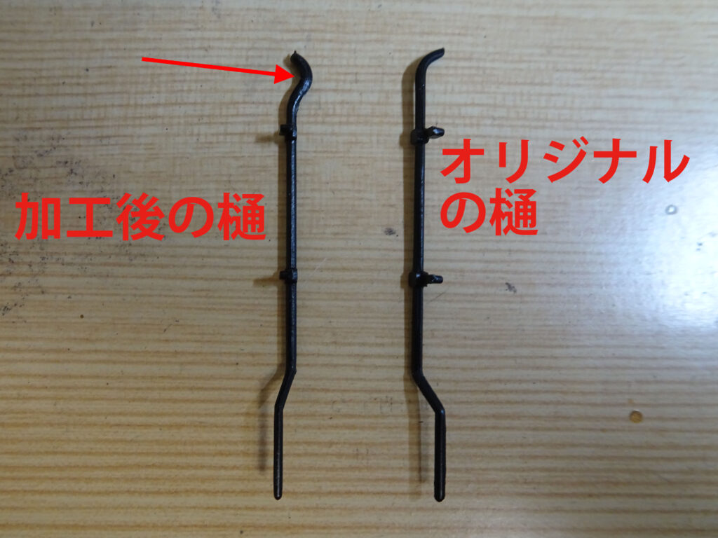 オリジナルの樋は画像3左の右側の部品ですが、このままでは運転席屋根の角に若干の出っ張りがあり干渉してうまく取り付けられなかったので、この部分を画像3左のように熱を加えて曲げようとしました。一つ目はうまくいったのですが、二つ目は失敗してしまいました。やむを得ず左右両方とも、樋の上部だけを1mmの樹脂棒で作り継ぎ足すことにしました(画像3右)。