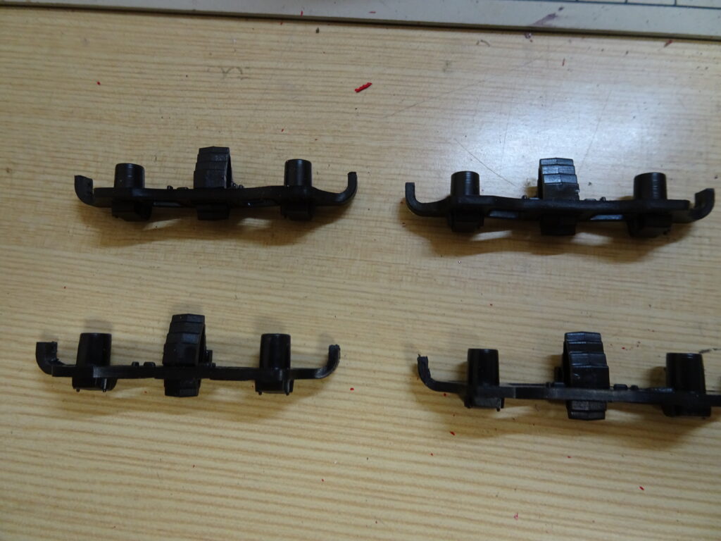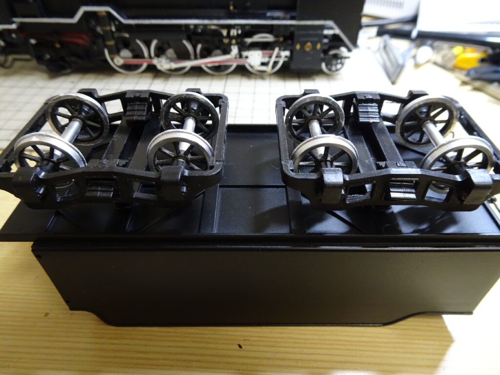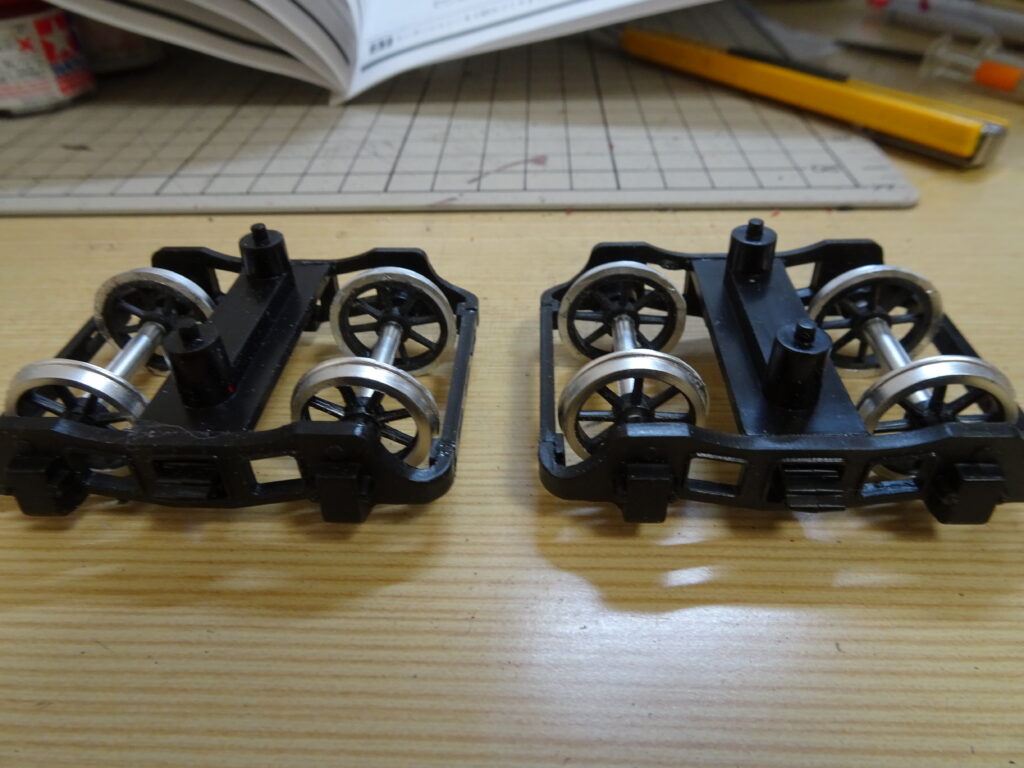 車輪は以前に動輪と同時に組み立て、塗装をしてあったのでこれを使用。台車枠に車輪をはめて、組み立てしました。