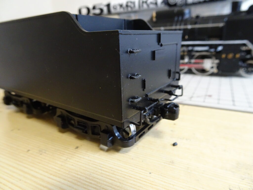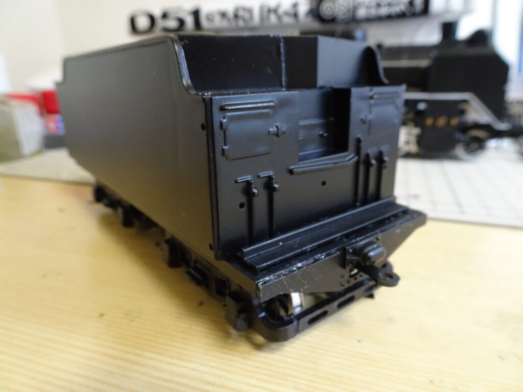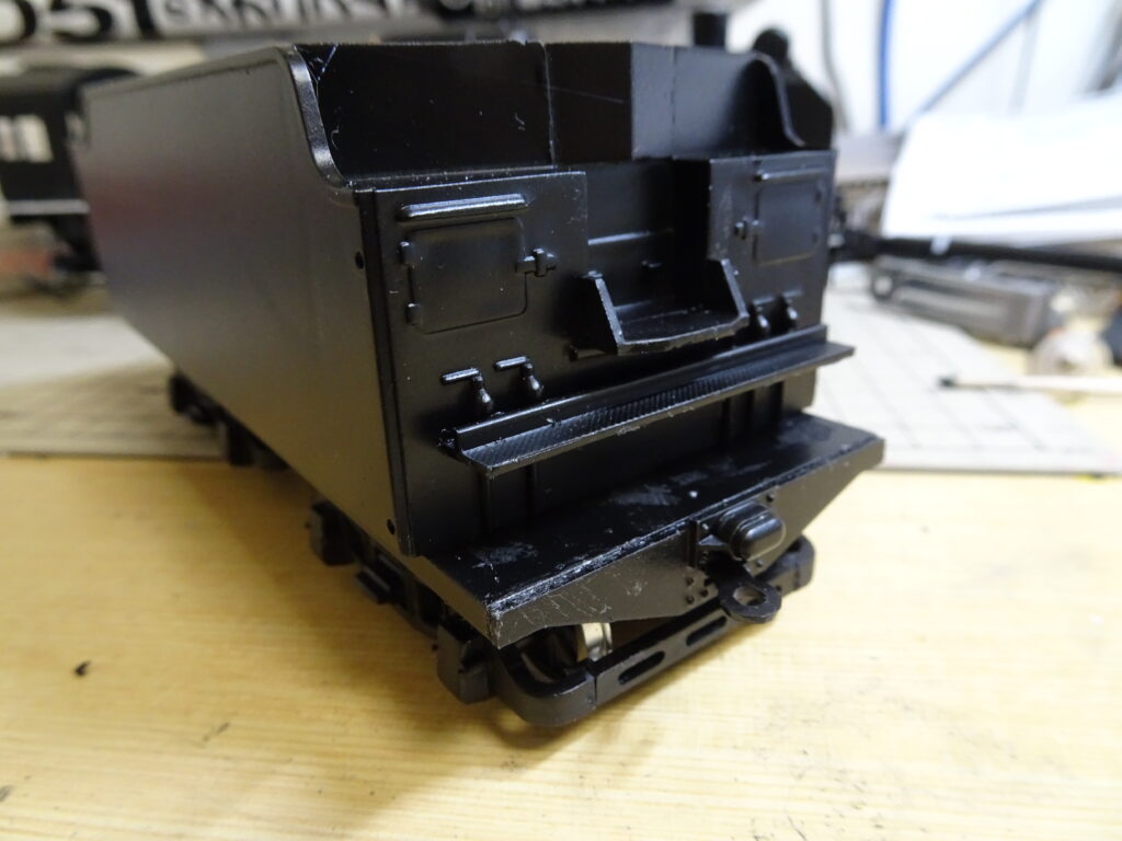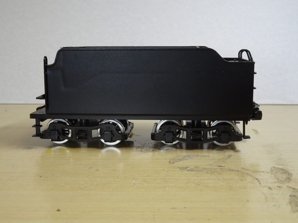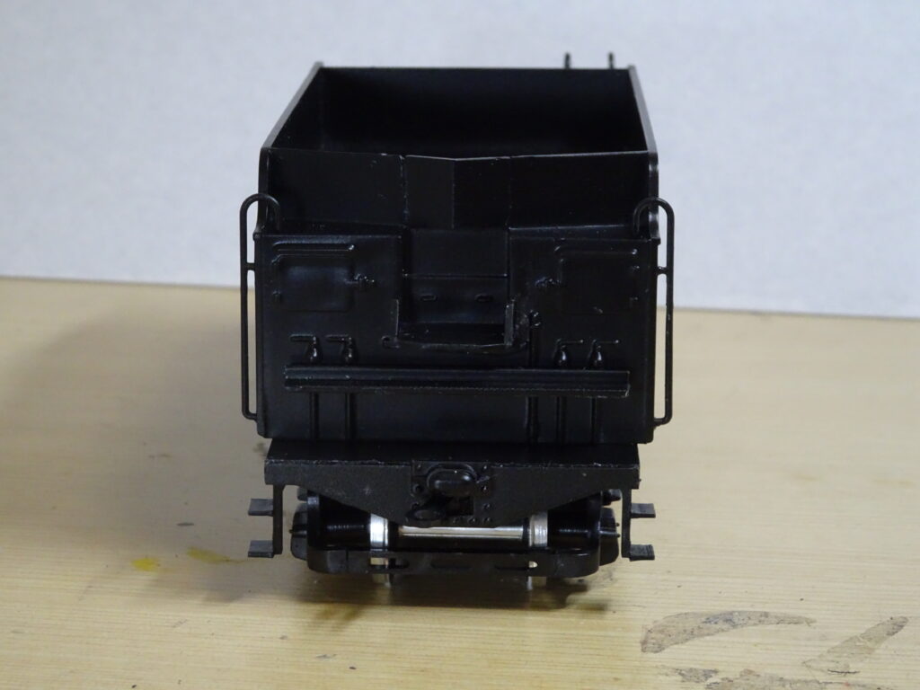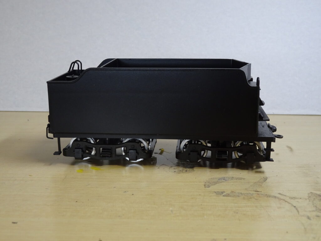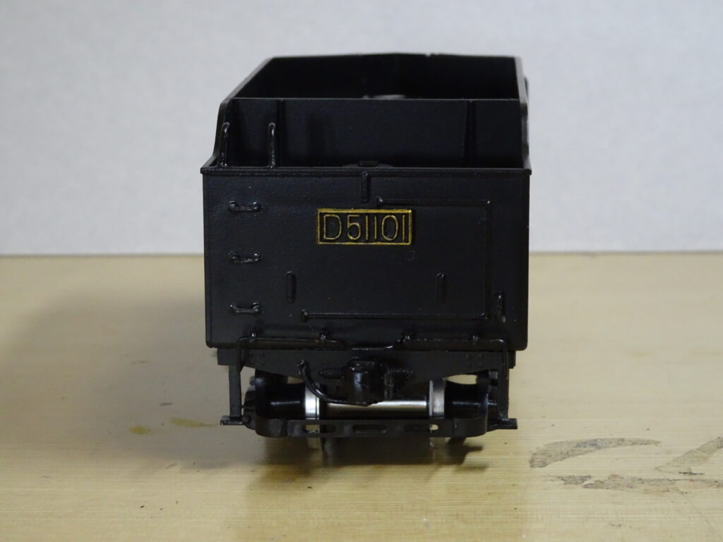 各部品を取り付けた炭水車は画像4のようになりました。全体の塗装はセミグロスブラックでスプレーしています。ナンバープレートはセミグロスブラックでスプレー後に、文字をゴールドで筆塗りしました。